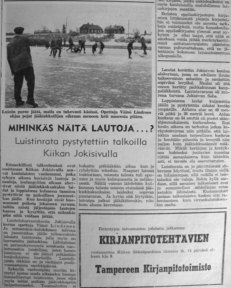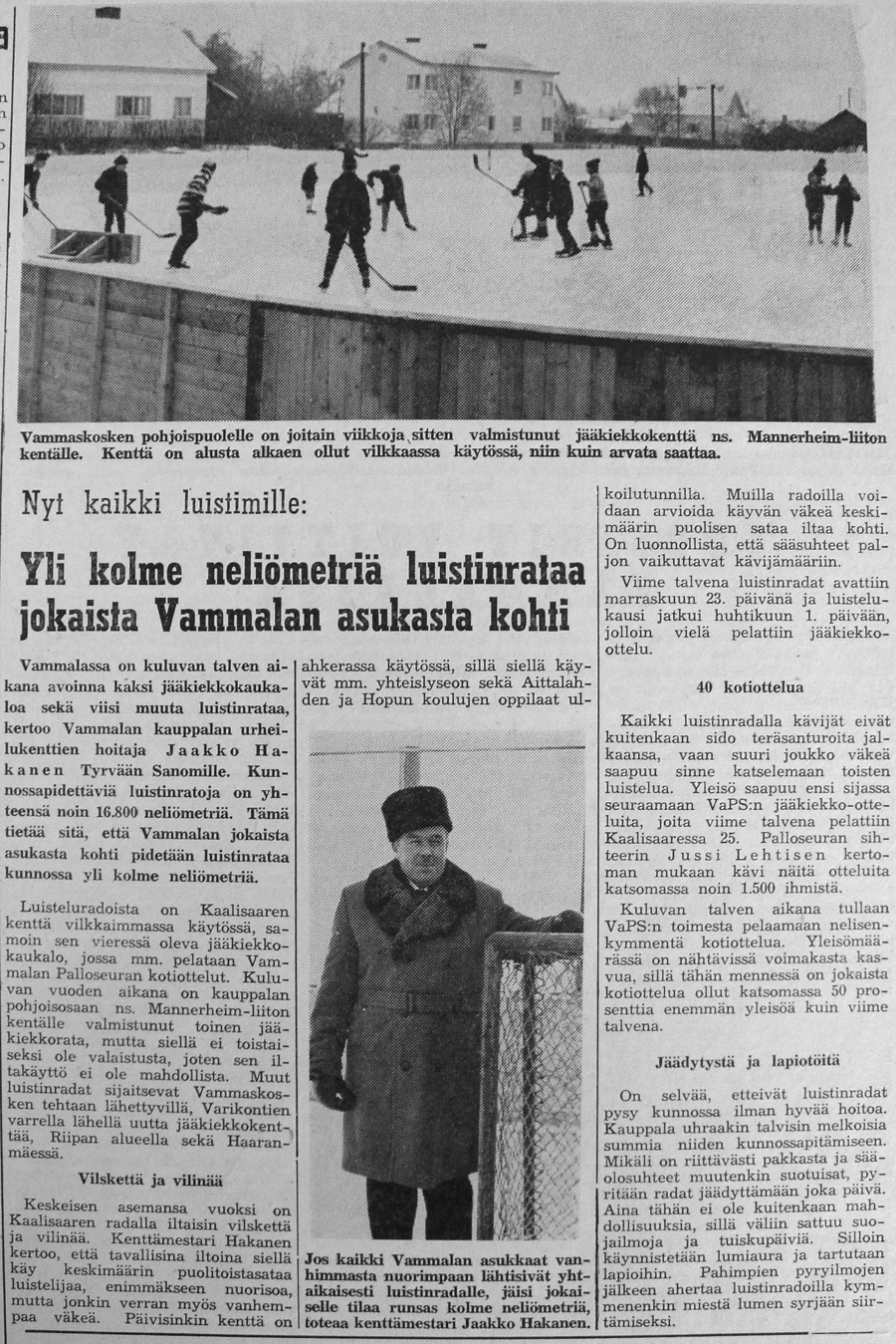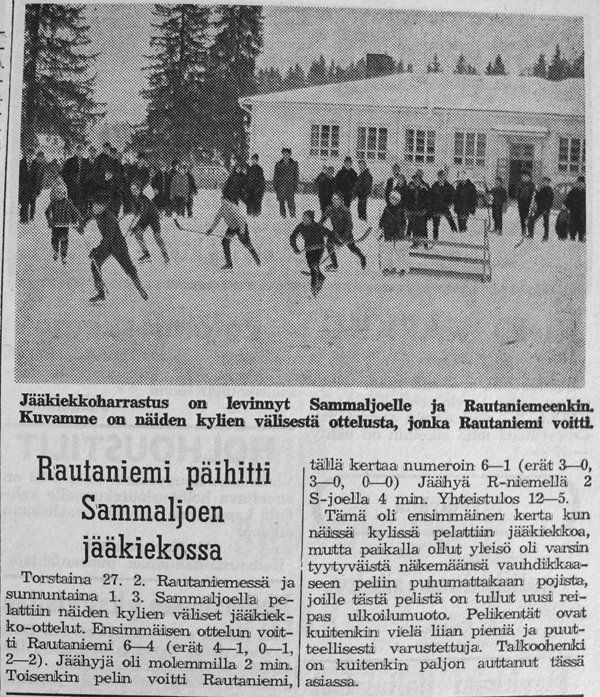 Ainakin monelle Suur-Tyrvään natiaiselle! Paikallislehti kertoi kolmessa eri jutussa kevättalvella 1964 jääurheilun leviämisestä alueella uusien mahdollisuuksien myötä. Vammaskosken pohjoispuolelle oli valmistunut ns. Mannerheim-liiton kenttä, opettaja Väinö Lindroosin johdolla pystytettiin talkoilla Kiikan Jokisivun kenttä sekä Sammaljoelle ja Rautaniemeen oli saatu luistinradat. Näissä jälkimmäisissä kamppailtiin myös kylien välisistä mestaruuksista, joissa Rautaniemi oli tuolloin niskan päällä.