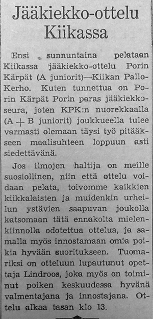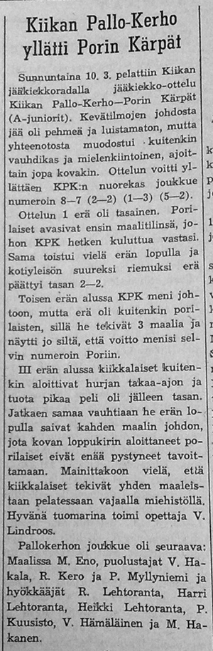 Kiikan Pallo-Kerho löi Porin Kärpät Parton kaukalossa! KPK:n rungon muodostivat maalivahti M Eno, puolustajat V Hakala, R Kero ja P Myllyniemi ja hyökkääjät R Lehtoranta, Harri Lehtoranta, Heikki Lehtoranta, P Kuusisto, V Hämäläinen ja M Hakanen.