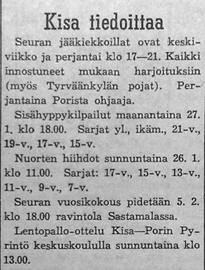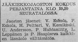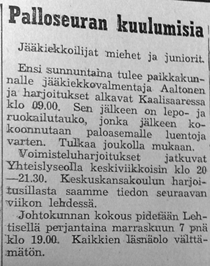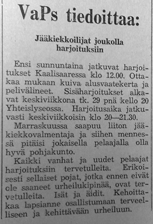Heikki Aaltonen Raumalta toimi Kaalisaaressa järjestyn valmennustapahtuman vetäjänä. Jääkiekkoon haettiin uusia harrastajia: "Erikoisesti sellaiset pojat, jotka eivät ennen ole saaneet urheilukipinää, ovat tervetulleita. Isät ja äidit. Kehoittakaa lapsianne osallistumaan terveelliseen ja kehittävään urheiluun".