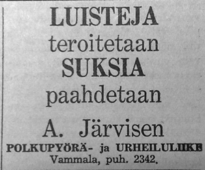 "Luisteja teroitetaan ja suksi paahdetaan" kertoi Aimo Järvisen mainos. Huhtaniityn Pentti sai Aimo Järvisestä vankan kilpailijan luistien teroitusmarkkinoilla!