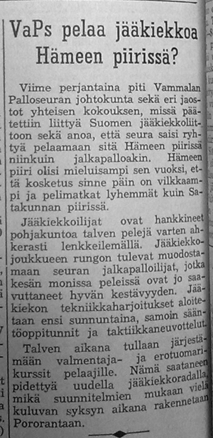 "Jääkiekkoilun ensiesiintyminen" Vammalassa 19.1.1958 sai palstatilaa Tyrvään Sanomissa. Ottelun tuomareiksi oli valittu Kiikan Pallo-Kerhon taustahahmo, opettaja Väinö Lindroos Kiikasta sekä entinen mestaruussarjapelaaja Heikki Aaltonen Raumalta. Ottelu oli samalla lajin opetustuokio, sillä raumalaiset esittivät katsojille näytösluontoisen harjoituksen. "Kaikki talviurheilun ystävät suuntaavat askeleensa sunnuntaina Kaalisaareen katsomaan ensimmäistä Vammalassa suoritettavaa jääkiekko-ottelua" mainostettiin lehdessä etupeltoon.