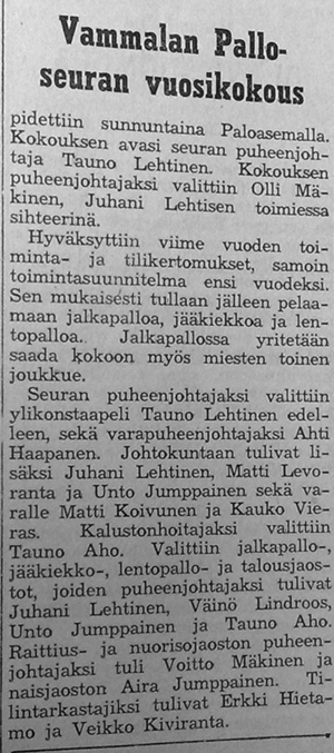 Palloseuran ensimmäisessä miesten joukkueessa pelasivat ainakin maalivahti Eero Nurmi, ykköskenttänä Matti Hakala - Raimo Toivonen - Harri Ahtikoski - Jussi Lehtinen - Kalevi Kalliomäki, kakkoskenttänä Kari Raivio - Alpo Uurto - Antti Levoranta - Pentti Hyrkki - Ilkka Välimäki ja kolmoskenttänä Ahti Haapanen - Timo Järvelä - Kulmala.
