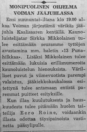 Voima jatkoi jääjuhlien järjestämisperinnettään: vuoden 1958 vetonaulana olivat värilliset puvut ja edellisvuotta parempi valaistus. Yleisöä viihdyttämään oli hankittu taiteilija Eero Roine Tampereelta.