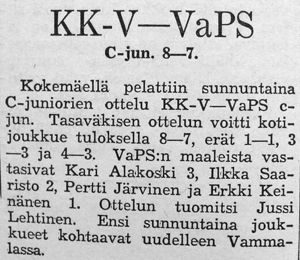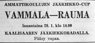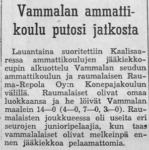 Vammalan Ammattikoulun matka jääkiekko cupissa päättyi 14-0 tappioon raumalaisille. "Raumalaisten joukkueessa oli useita eri seurojen junioripelaajia, kun taas vammalalaiset olivat melkeinpä ennen jääkiekkoa pelaamattomia."