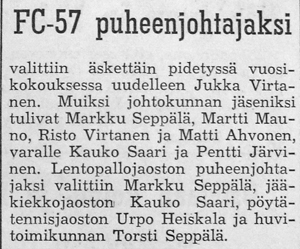FC-57 piti vuosikokoustaan nimeten Kauko Saaren jääkiekkojaoston puheenjohtajaksi.