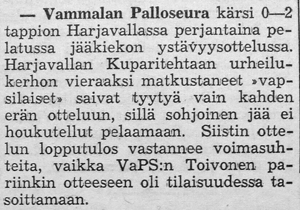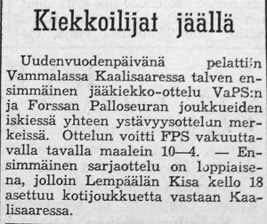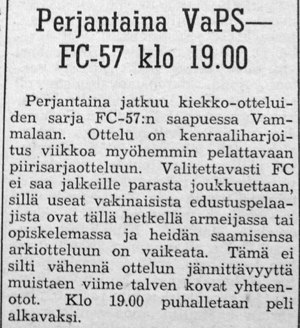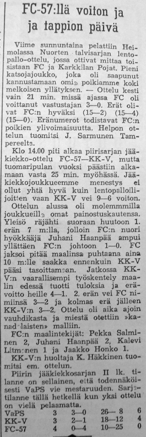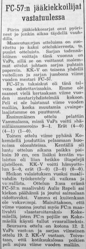 Kiekkotalvi käynnistyi perinteisellä VaPS_FC-57 -ottelulla. Lehti-ilmoituksen mukaan joukkueiden välisissä otteluissa on "aina ollut sähinää ja kovaa yritystä"!