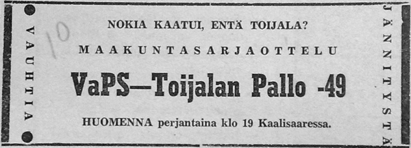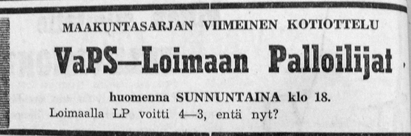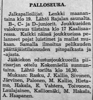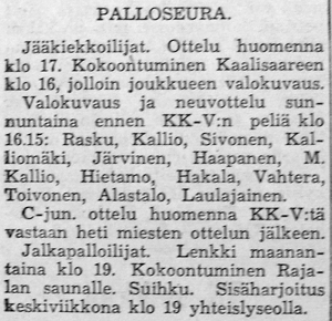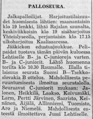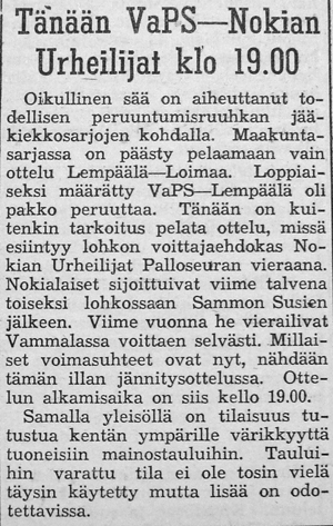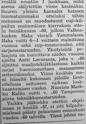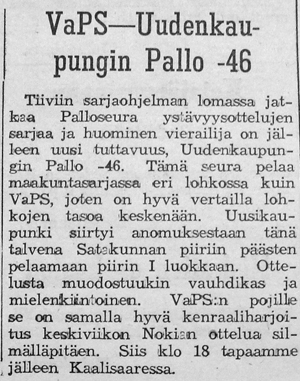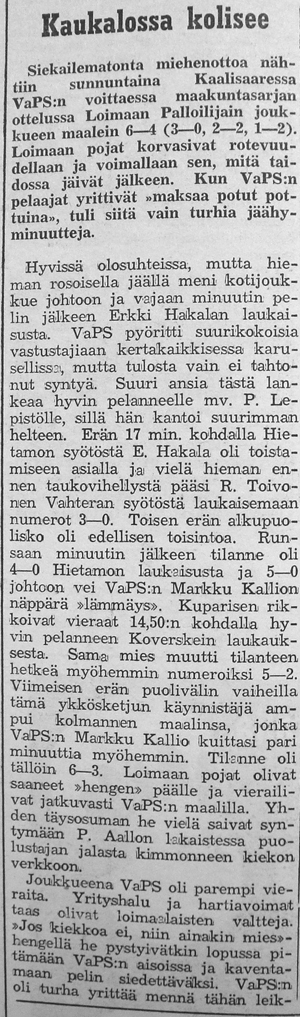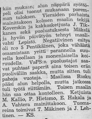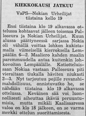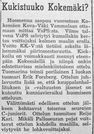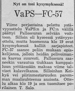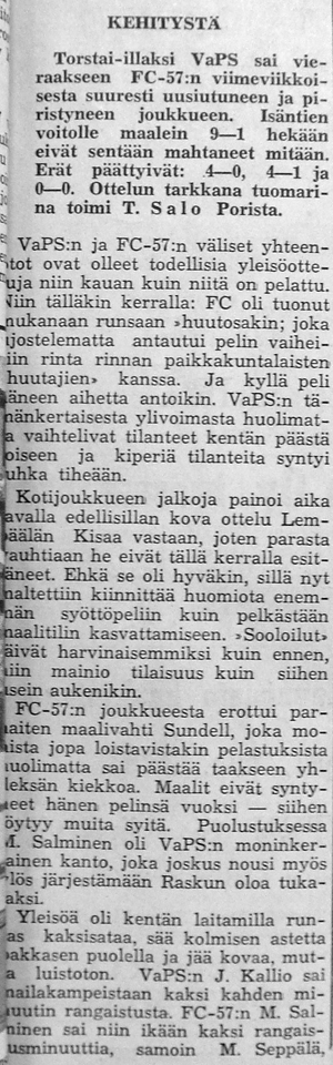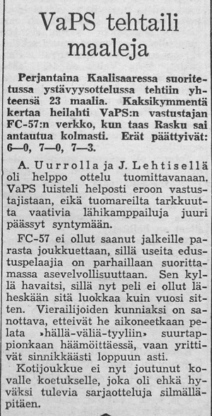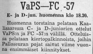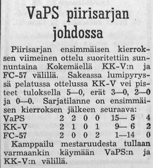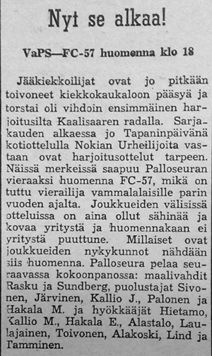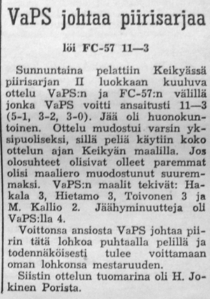 Edellisen kauden piirisarjan mestari FC-57 manasi lehden palstoilla heikosti käyntiin lähtenyttä kauttaan. Ottelut Kokemäellä olivat osoittautuneet vaarallisiksi, sillä jo toisen kerran pelaaja oli joutunut ottelussa "tikattavaksi" - tällä kertaan ottavana osapuolena oli ollut joukkueen maalivahti Aulis Rapeli.