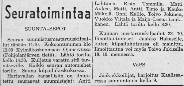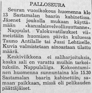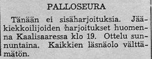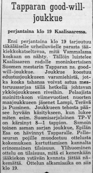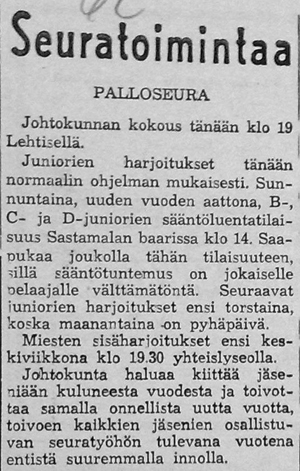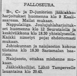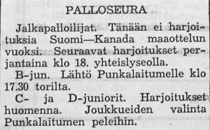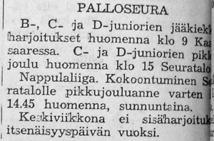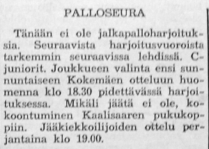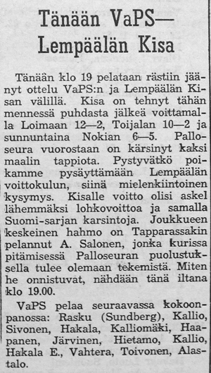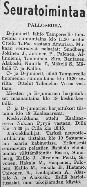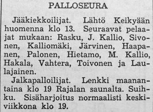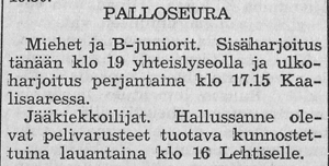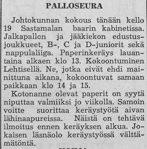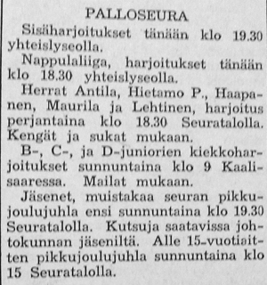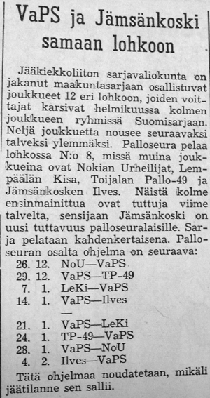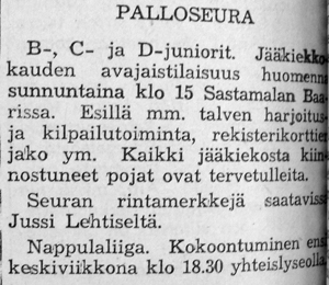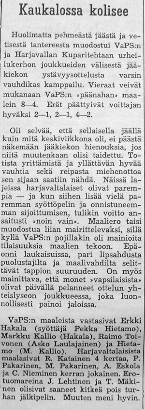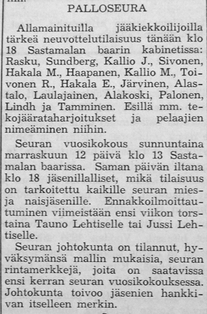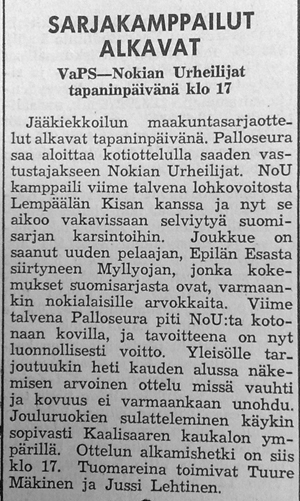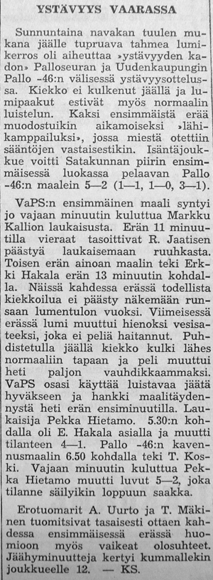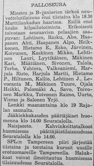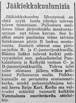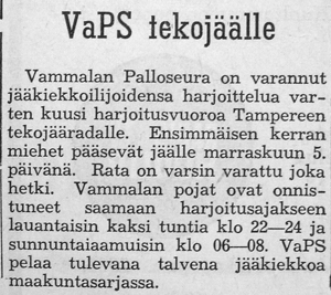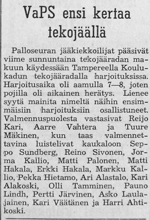 Palloseuran edustus pääsi ensimmäistä kertaan tekojään makuun. Koska kyseessä oli lähes "veretseisauttava" tapahtuma, julkistettiin mukana olleiden nimet lehdessä. Nämä sankarit olivat: Seppo Sundberg, Reino Sivonen, Jorma Kallio, Matti Palonen, Matti Hakala, Erkki Hakala, Markku Kallio, Pekka Hietamo, Ari Alastalo, Kari Alakoski, Olli Tamminen, Pauno Lindh, Pertti Järvinen, Asko Laulajainen, Kari Väätänen ja Harri Ahtikoski. Valmentajina toimivat Reijo Kari, Aarre Vahtera ja Tuure Mäkinen.