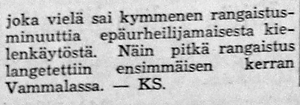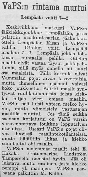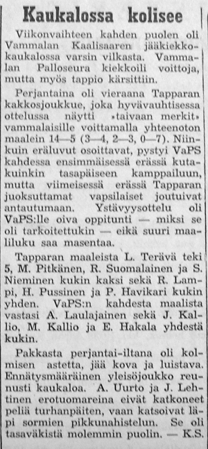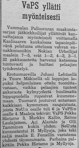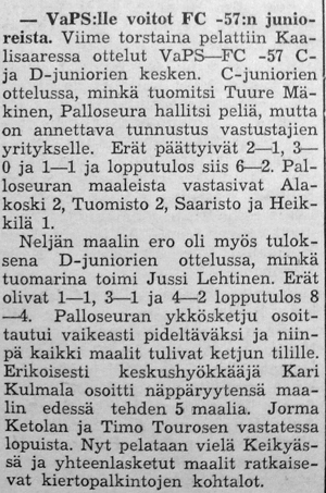 Piirisarjan ottelussa VaPS-FC-57 koettiin jotakin ennenkuulumatonta! FC-57:n M Seppälä sai tyrvääläisen kiekkohistorian ensimmäisen 10 minuutin käytösrangaistuksen epäurheilijamaisesta kielenkäytöstä. Moiseen törkeyteen ei oltu paikkakunnalla aiemmin törmätty, joskin myöhempinä vuosina tilanne uusiutui useammankin kerran.