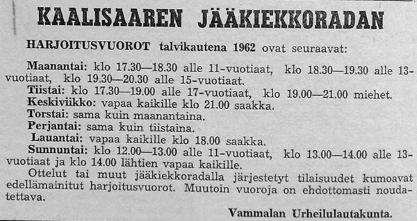 Kaalisaaren jääkiekkoradan käyttöajat talvikaudelle 1962 julkaistiin.