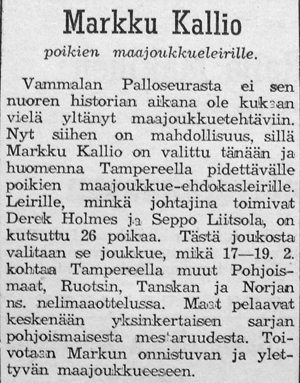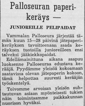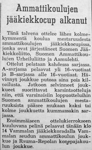 Vammalan Ammattikoulu lähti mukaan Ammattikoulujen jääkiekko cupiin. Vastaan asettui Rauma-Repolan konepajakoulun joukkue. Palloseuran lupaava juniori, Markku Kallio, valittiin poikien maajoukkueleirille, josta oli mahdollisuus päästä Suomen maajoukkue-edustajaksi tulevaan nelimaaotteluun.