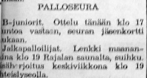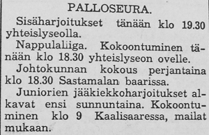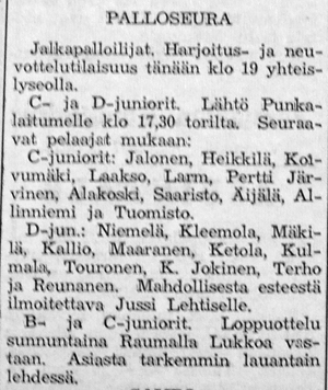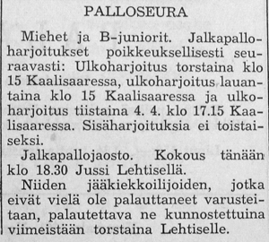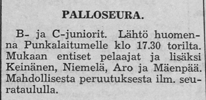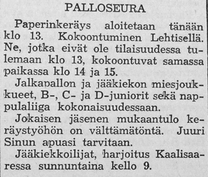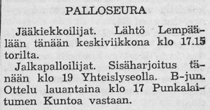 Keikyällä harrastettiin myöhemmin tutuksi tullutta "two in one -menetelmää". Samaan päivään penkkiurheilijoille tarjottiin lentopallo- ja jääkiekkoviihdettä! Palloseuran B- ja C -juniorit matkasivat Raumalle pelaamaan, vastustaja sekä lopputulokset ovat tunnistamattomia. Koska pelipaitoja ei ollut, kuin edustusjoukkueelle, piti sen pelaajien toimittaa omat pelipaitansa Jussi Lehtiselle, jotta ne saatiin junioreiden käyttöön. Elettiin siis edelleen sodanjälkeistä pula-aikaa.