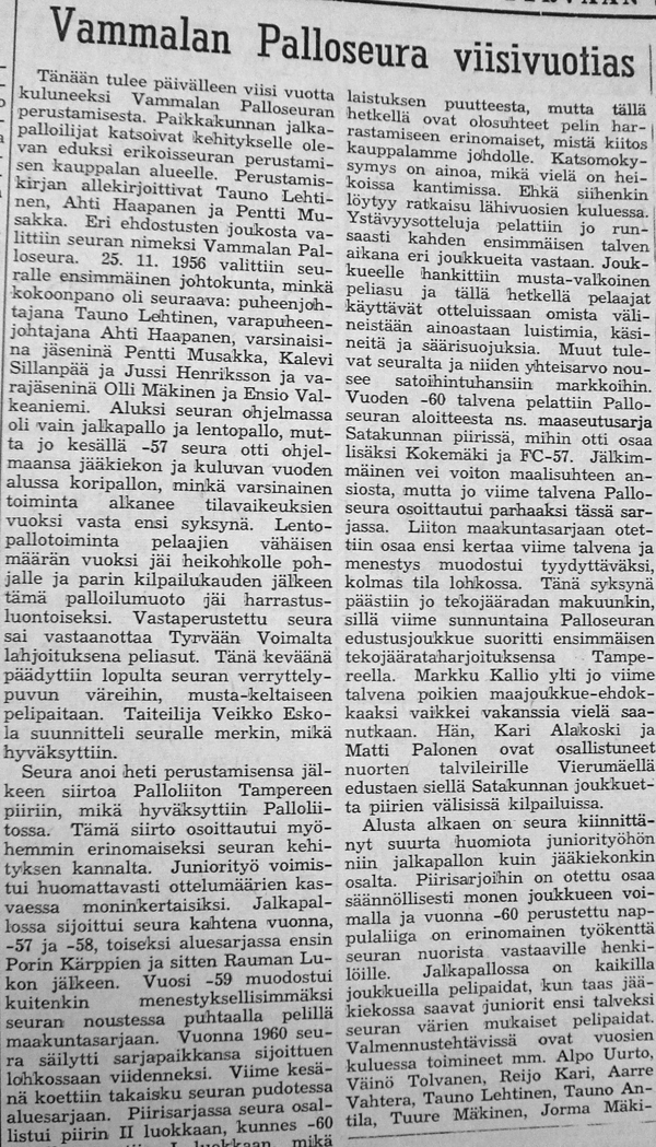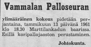 Vammalaan perustettiin erotuomarikerho syksyllä 1961. Sen ensimmäisenä puheenjohtajana toimi herra Reijo Kari, joka sai valtuudet määrätä tuomarit kaikkiin Vammalassa suorittaviin otteluihin. Palloseura päätti osallistua tulevana talvena (1962) maakuntasarjaan.