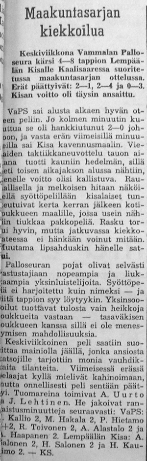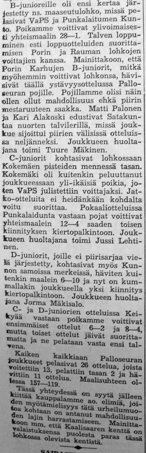 Piirisarjassa VaPSin menestyi Maakuntasarjaa paremmin. Vastassa olivat tutut KKV ja FC-57. Porin Karhut saapuivat Kaalisaareen B- ja C-junioreiden voimin. Seura Porin Karhut syntyi Porin Kärppien lopettaessa jääkiekon 50 -luvun lopulla.
