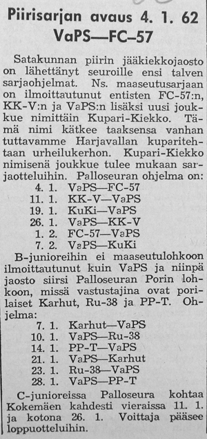 Piirisarjaan talveksi 1962 ilmoittautuivat FC-57, KKV ja Kupari-Kiekko. B-juniorit siirrettiin Porin lohkoon, jossa vastustajiksi oli tulossa Porin Karhut, RU-38 sekä Porin Pallo-Toverit. C-junioreiden vastustajaksi oli tulossa tuttu KKV.