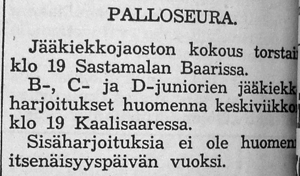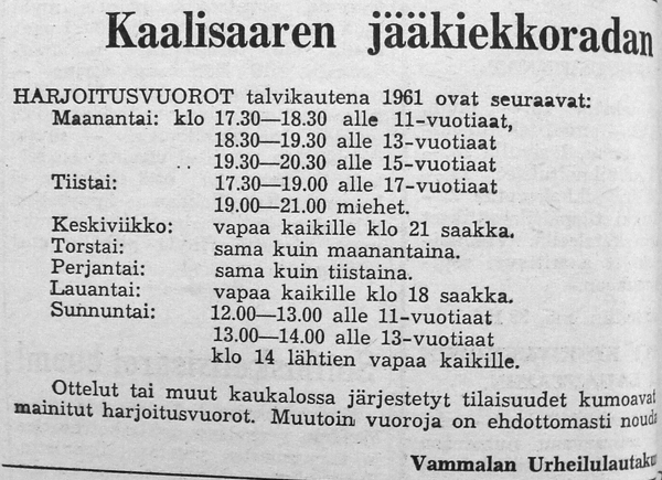 Koska Kaalisaaren kaukalo oli kovassa käytössä, teki Vammalan Urheilulautakunta kentälle käyttöajat, jotka perustuivat pelaajien ikään.