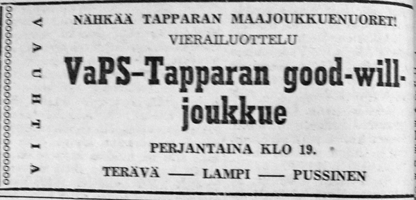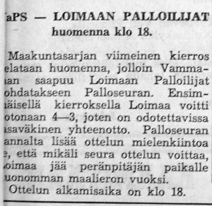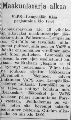 VaPS lähti mukaan kertaa Maakuntasarjaan. Edelliskautena pelattiin Maaseutusarjaa, josta myöhemmin käytettiin nimitystä Piirisarja. Vaikuttaa ilmeiseltä, että eri Piirisarjaan sekä Maakuntasarjaan pääsi mukaan ilmoittautumalla, eli varsinaisia karsintoja ja/tai edelliskauden menestysvaateita ei vielä tuolloin ollut. Maakuntasarjasta Suomisarjaan nousivat vain lohkojen voittajat jatkokarsintojen myötä. Palloseuran ensimmäisessä harjoitusottelussa kohdattiin Forssan Palloseura.