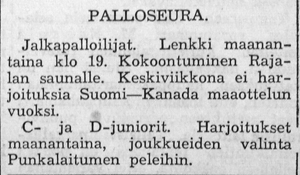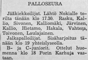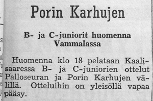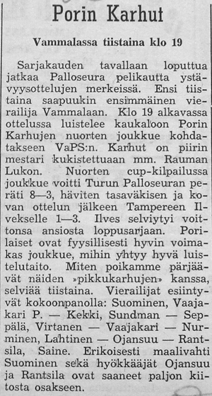 Porin Karhujen "nuorten joukkue" saapui kohtaamaan Palloseuran edustuksen. Karhut olivat maineikas ja hyvin menestynyt joukkue, joka oli ehtinyt kaatamaan mm. Rauman Lukon. Joukkueen nimimiehiä olivat erikoisesti maalivahti Suominen sekä hyökkääjät Ojansuu ja Rantasila. Näistä Juha Rantasila muistetaan myös myöhemmin monivuotisena maajoukkuepuolustajana HIFK:n riveistä. Pelaajakasvatuksesta pidettiin huolta peluuttamalla myös E- ja D-junioreita. Sarjapelejä ei heillä vielä ollut, mikä korvattiin ystävyysotteluina keikyäläisiä vastaan.
