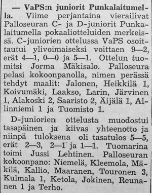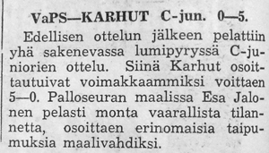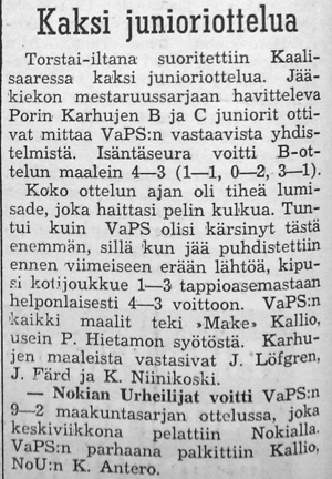 Palloseuran B-juniorit kaatoivat Porin Karhut 4-3, mutta C-juniorit joutuivat puolestaan taipumaan 0-5. Ottelussa koettiin tyypillinen ulkojäitä piinannut ilmiö, lumisade. "Koko ottelun ajan oli tiheä lumisade, joka haittasi pelinkulkua. Tuntui, kuin VaPS olisi kärsinyt tästä enemmän, sillä kun jää puhdistettiin ennen viimeiseen erään lähtöä, kipusi kotijoukkue 1-3 tappioasemastaan helponlaisesti 4-3 voittton."