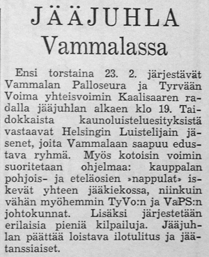 Jääjuhlaa ei unohdettu! Helsinkiläisten taitoluisteluesityksen lisäksi tapahtumassa kohtasivat kauppalan pohjois- ja eteläosien nappulat jääkiekossa, kuten Tyrvään Voiman ja VaPSin johtokunnat. Tapahtuma päättyi loistavaan ilotulitukseen ja jäätanssiaisiin.