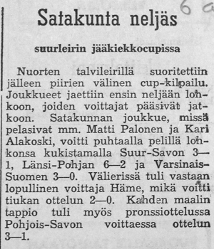 Matti Palonen ja Kari Alakoski valittiin Satakunnan joukkueen jääkiekon suurleirille (nykyinen Pohjola -leiri). Joukkue voitti oman lohkossa, mutta karahti välierävaiheessa cupin voittaneeseen Hämeeseen 2-0. Takkiin tuli myös pronssiottelussa Pohjois-Savoa vastaan 3-1. Matin ja Karin valinta suurleirille oli hyvä osoitus poikien kyvyistä sekä Palloseuran junioritoiminnasta.