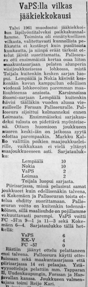 Kiekkokauden yhteenveto: Kiekkotalvi 1961 muodostui lajin läpimurtokaudeksi, vaikka kunnollista pelikautta ei kestänytkään, kuin puolitoista kuukautta. Edustusjoukkueessa esiintyi 14 eri pelaajaa. B-junioreille järjestettiin ensimmäistä kertaa ns. maaseutulohko. Talven loppuminen esti loppuotteluiden suorittamisen Porin ja Rauman lohkojen voittajien kanssa.