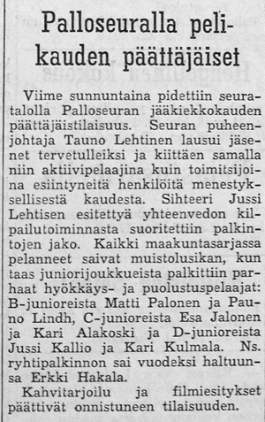 Pelikauden päättäjäisissä palkittiin kaikki maakuntasarjaan osallistuneet muistolusikalla. Juniorijoukkueista palkittiin parhaat hyökkäys- ja puolustuspelaajat. B-junioreista Matti Palonen ja Pauno Lindh, C-junioreista Esa Jalonen ja Kari Alakoski ja D-junioreista Jussi Kallio ja Kari Kulmala. Ns. ryhtipalkinnon sai vuodeksi haltuunsa Erkki Hakala.