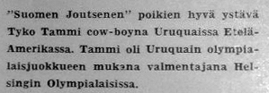Kisakylästä uruguaylaisten majapaikasta tapasivat Helsingin Sanomain edustajat eilen miehen, joka eloisasti elehtien maisteli eteläamerikkalaista matee -juomaa ja samalla kertoili elämänvaiheitaan. Hän kertoi lähteneensä Helsingistä 29 vuotta sitten ammattinyrkkeilijäksi Uruguayhin, missä hän myöhemmin siirtyi valmennustehtäviin. Montevideossa sijaitsevan valtionyliopiston opettajana ja Suomen erikoistuntijana entinen hausjärveläispoika, nykyinen professori Tyko Tammi on nyt saapunut synnyinmaahansa Uruguayn olympiajoukkueen johtajistoon kuuluvana.