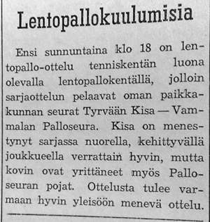 Vammalassa lentopalloa pelasivat Tyrvään Kisa, Vammalan Palloseura ja Tyrvään Voima. Voima tosin ei osallistunut sarjatoimintaan, mutta sen jäsenistöstä sekä miehet että naiset harrastivat lajia. Kaikki seurat käyttivät talviharjoitteluun Keskuskoulua tai Keskuskansakoulua eli tutummin Muistolan koulua. Kesäaikaan harjoiteltiin Poronrannan kentällä. VaPS ja Kisa pitivät myös yhteisharjoituksia.