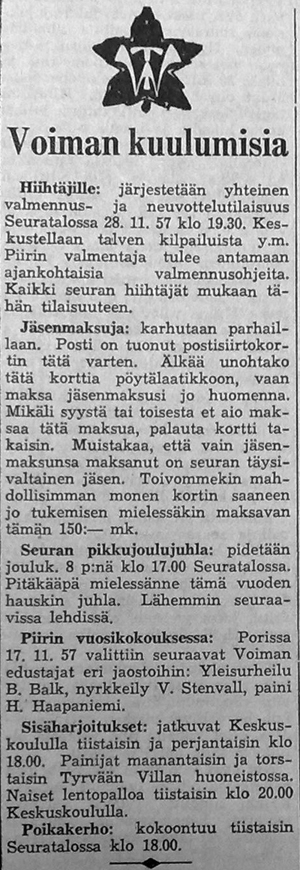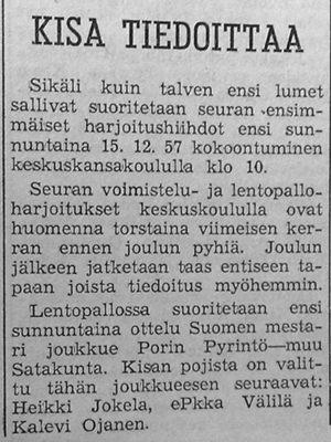 Alla olevat kuvat ovat peräisin vuoden 1957 Tyrvään Sanomista. Kuvat ovat periaatteessa aikajärjestyksessä.
