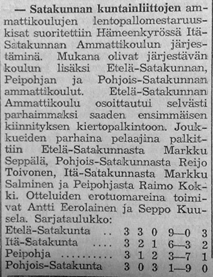Etelä-Satakunnan Ammattikoulu (Vammalan Ammattkoulu) jyräsi Satakunnan mestaruuden vakuuttavasti. Mestareiden kapellimestarina toimi nuorten maajoukkueessa pelannut Markku Seppälä.