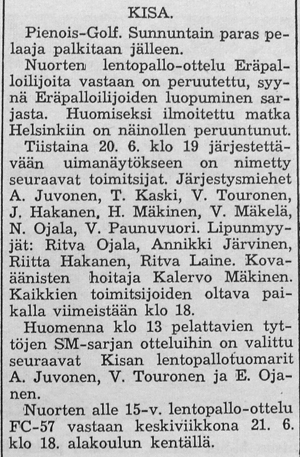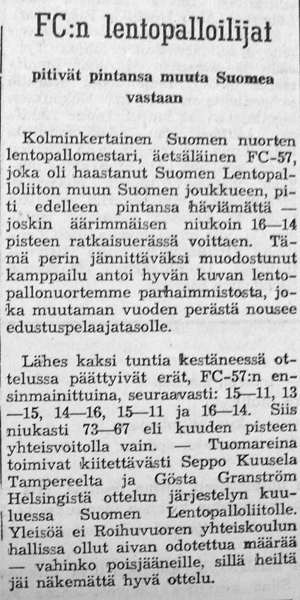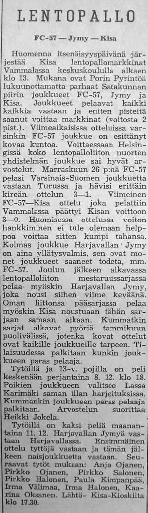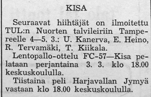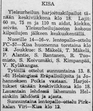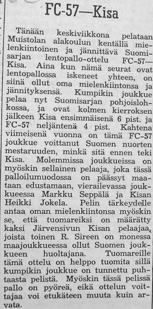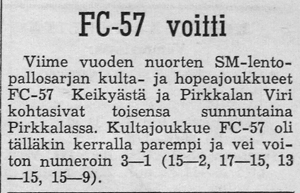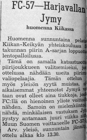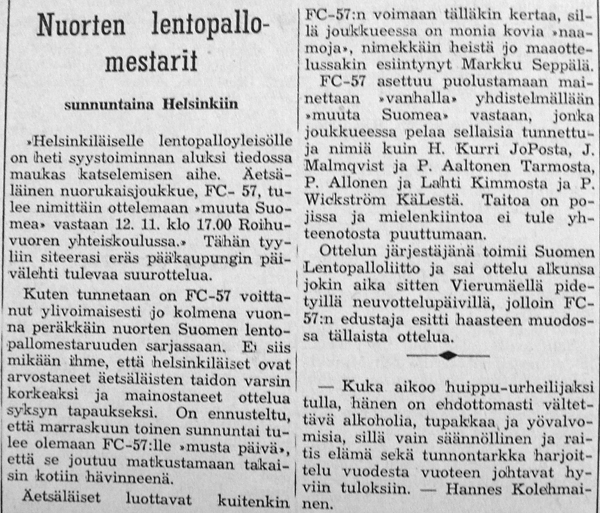 Syksyllä 1961 järjestettiin Helsingissä ottelu FC-57:n "voittamattomat nuoret" vastaan muun Suomen joukkue. Ennakkoon ounasteltiin kyseisestä pelipäivästä tulevan "musta päivä" keikyäläisille.