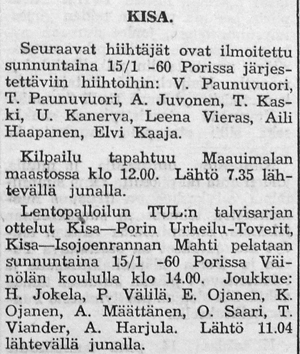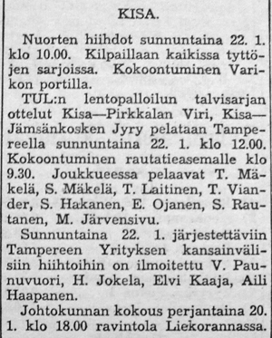 Kisa lähti mukaan TUL:n talvisarjaan, jossa pelasivat Kisan lisäksi Isojoenrannan Mahti, Porin Urheilu-Toverit ja Harjavallan Työväen Urheilijat.