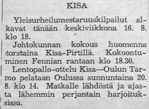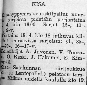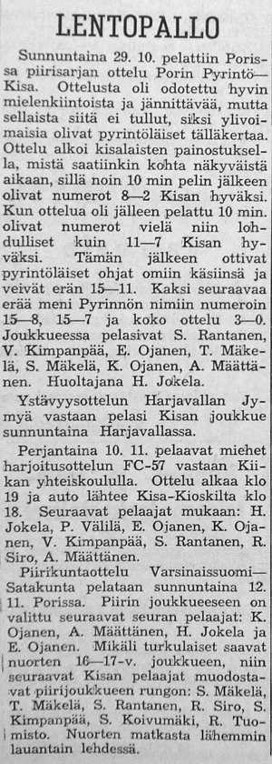 17 -vuotiaiden piiriotteluun Varsinais-Suomi - Satakunta valittiin Kisan joukkue edustamaan Satakuntaa. Joukkueessa pelasivat S. Rantanen, T. Mäkelä, S. Mäkelä, R. Siro, S. Kimpanpää, R. Tuomisto ja R. Koivumäki. Satakunta eli siis Kisan joukkue voitti ottelun puhtaasti 3-0.