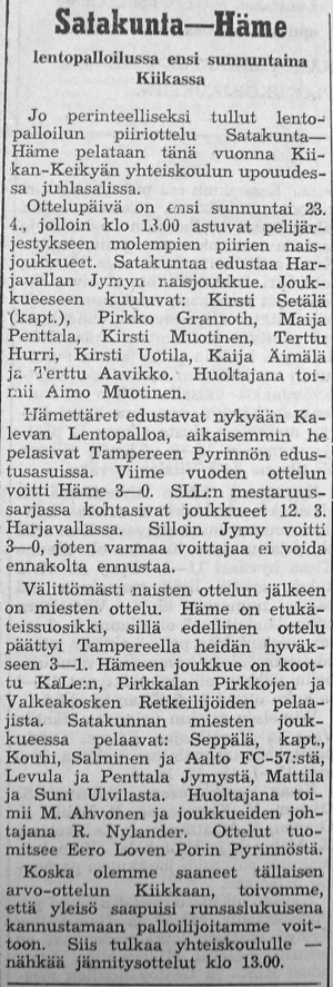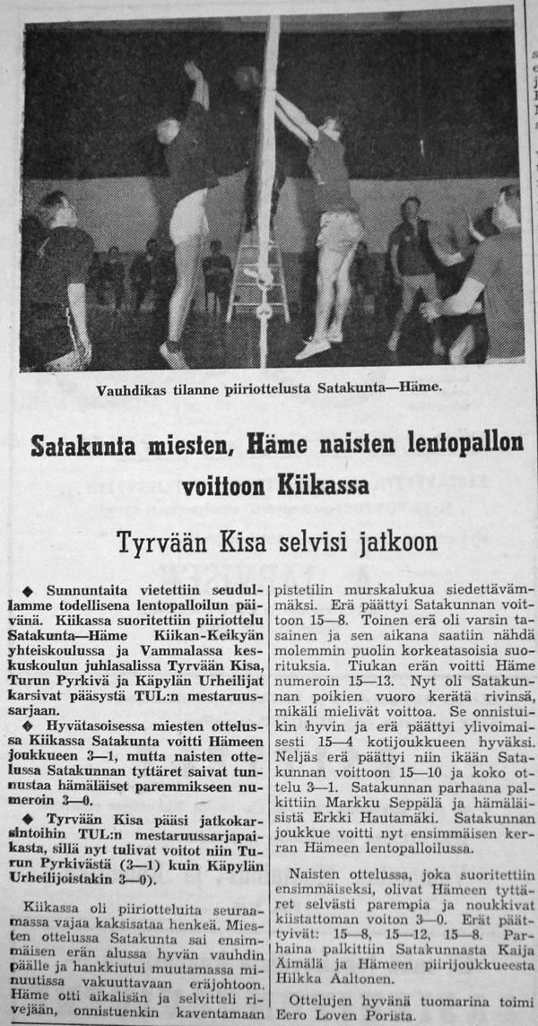 Lentopalloilun piiriottelu Satakunta-Häme pelattiin Kiikan-Keikyän yhteiskoulun upouudessa juhlasalissa.