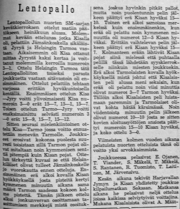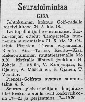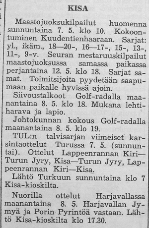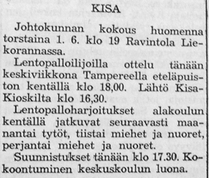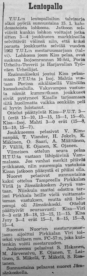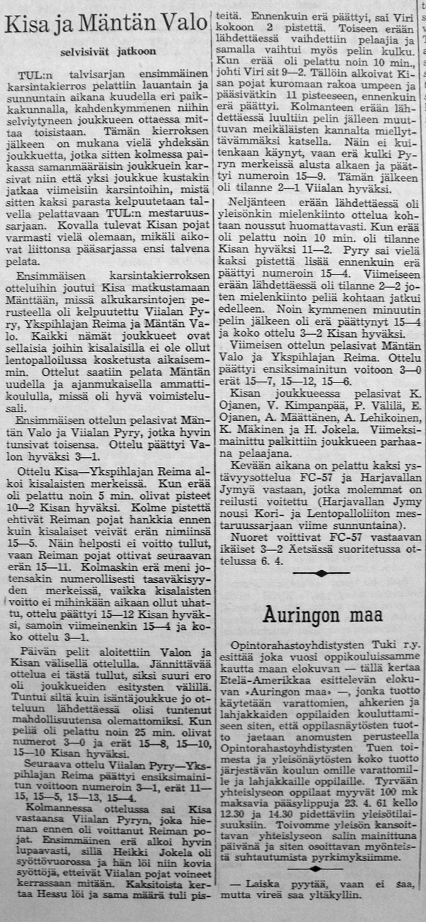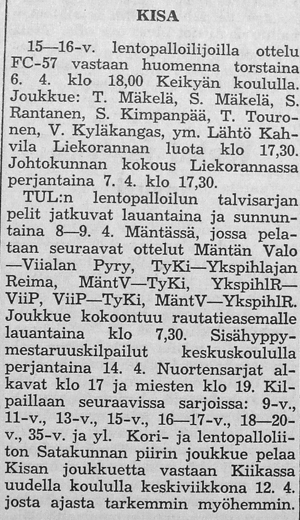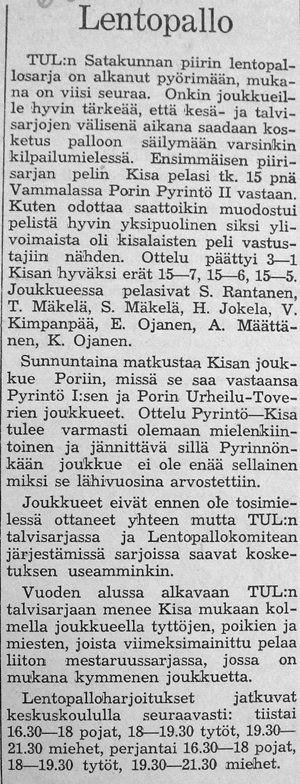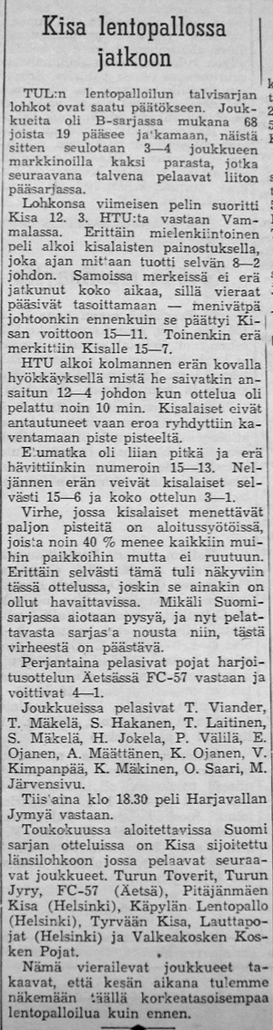 Kisan voitti TUL:n talvisarjan lohkonsa ja pääsi jatkoon 19:sta parhaan joukkoon. Toukokuussa aloitettavan Suomi-sarjan otteluissa on Kisa sijoitettu länsilohkoon, jossa pelaavat seuraavat joukkueet: Turun Toverit, Turun Jyry, FC-57 (Äetsä), Pitäjänmäen Kisa (Helsinki), Käpylän Lentopallo (Helsinki), Tyrvään Kisa, Lauttapojat (Helsinki) ja Valkeakosken Kosken Pojat. "Nämä vierailevat joukkueet takaavat, että kesän aikana tulemme näkemään täällä korkeatasoisempaa lentopalloa, kuin ennen."