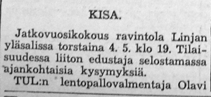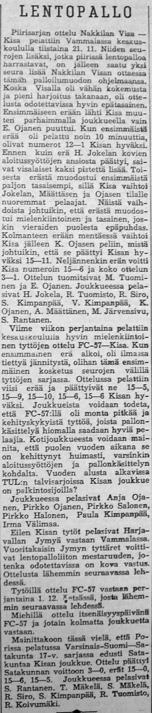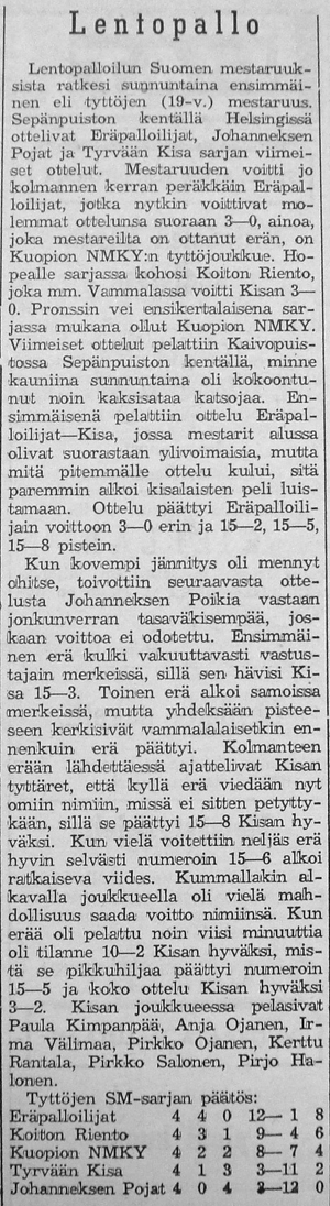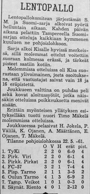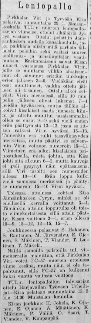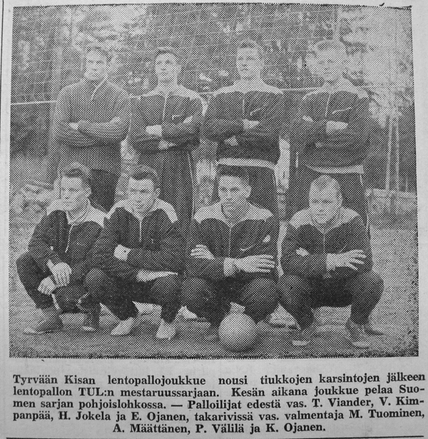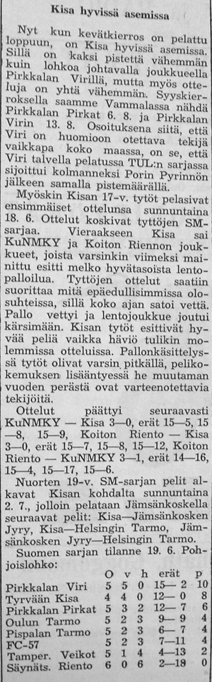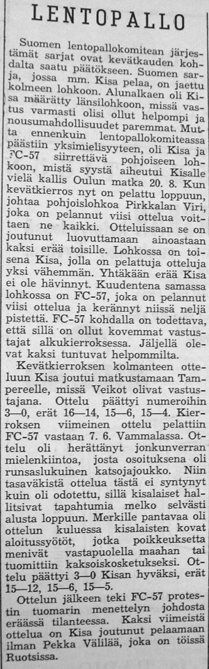 Lopulta kävi niin, että Kisan nousi TUL:n SM sarjaan. Ilmeisesti sekä TUL että Suomen Kori- ja Lentopalloliitto pelasivat edelleen erillistä talvisarjaansa nimellä "Liiton mestaruussarja", koska varsinaiset Lentopallokomitean järjestämät sarjat (Maakunta-, Suomi- ja Mestaruussarja) pelattiin aikavälillä kevät - syksy. Ennen Suomisarjan alkua Kisa siirrettiin länsilohkon sijaan pelaamaan pohjoislohkoon, jossa olivat mukana Kisan lisäksi Pirkkalan Viri, Pirkkalan Pirkat, FC-57, Pispalan Tarmo, Oulun Tarmo, Tampereen Veikot ja Säynätsalon Riento.