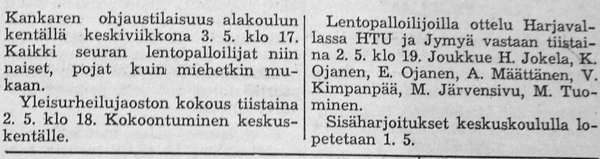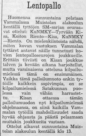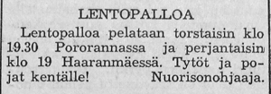 Myös urheilulautakunta tarjosi lentopallo nuorison harrastettavaksi. Lentopalloillat Poronrannassa ja Haaranmäessä käynnistettiin.