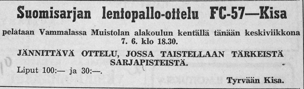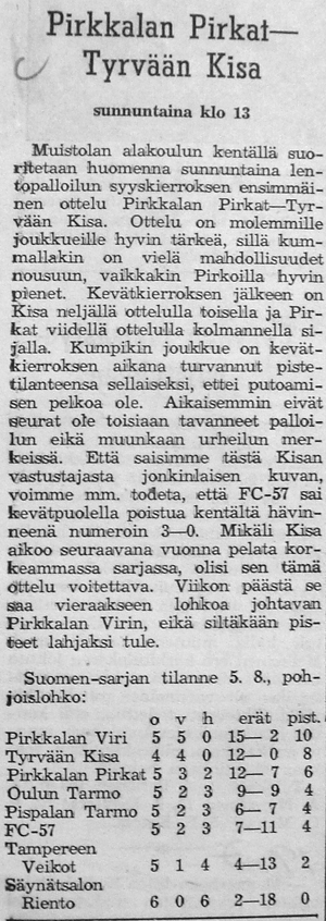Ottelut FC-57:tä vastaan olivat tärkeitä ja mielenkiintoisia, minkä vuoksi tuomarit oli valittava huolella. Keikyäläisten tähti oli nuorten maajoukkueessa esiintynyt Markku Seppälä, tyrvääläisten vastaavana toimi miesten maajoukkueeseen noussut Jokelan Heikki.