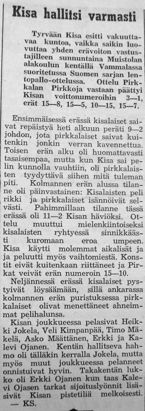 Suomisarjan ollessa puolivälissä alkoi käydä selväksi, että suurimmat voittajasuosikit olivat Kisa ja Pirkkalan Viri. Kisan miehistö heikentyi kesken sarjan, kun Välilän Pekka lähti Ruotsiin töihin.