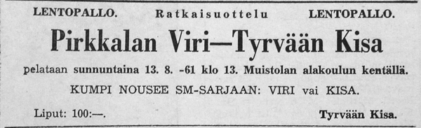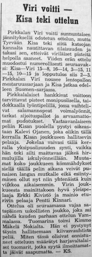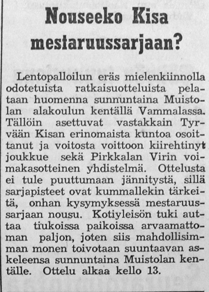 Suomisarjan edetessä kohden loppua Kisan esteenä lohkon voittamiseksi ja SM -sarjaan nousemiseksi oli enää Pirkkalan Viri. Kotiyleisön tukea ratkaisevaan kamppailuun toivottiin, koska se on "osoittautunut auttavat arvaamattoman paljon tiukoissa paikoissa".