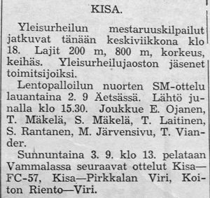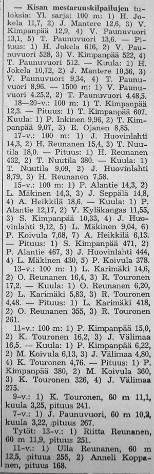 Jokelan Heikki ehti mukaan myös Kisan yleisurheilumestaruuskilpailuihin pyyhkäisten satasen käsiajanotolla aikaan 11,7. Pituudessa syntyi tulos 616 ja kuulassa 10,72.