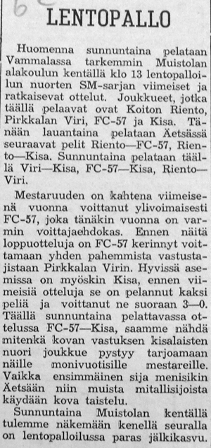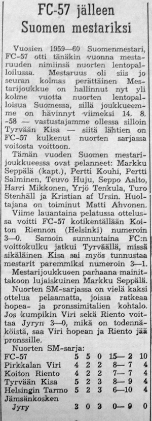 Nuorten SM -sarjan viimeinen ottelukierros käytiin Muistolan alakoulun kentällä. FC-57 voitti mestaruuden puhtaalla pelillä. Keikyäläiset olivat nyt dominoineet nuorten sarjoja viimeiset kolme vuotta. Edellinen tappio heille oli tullut 14.8.1958, jolloin vastassa oli ollut Tyrvään Kisa. Lopulta Kisa jäi sarjassa niukasti neljänneksi.