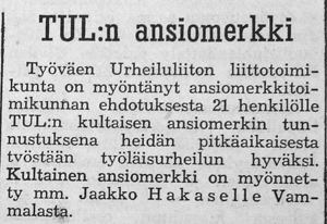 Kisan puheenjohtaja Jaakko "Jaska" Hakanen palkittiin TUL:n kultaisella ansiomerkillä tunnustuksena "pitkäaikaisesta työstään työläisurheilun hyväksi".